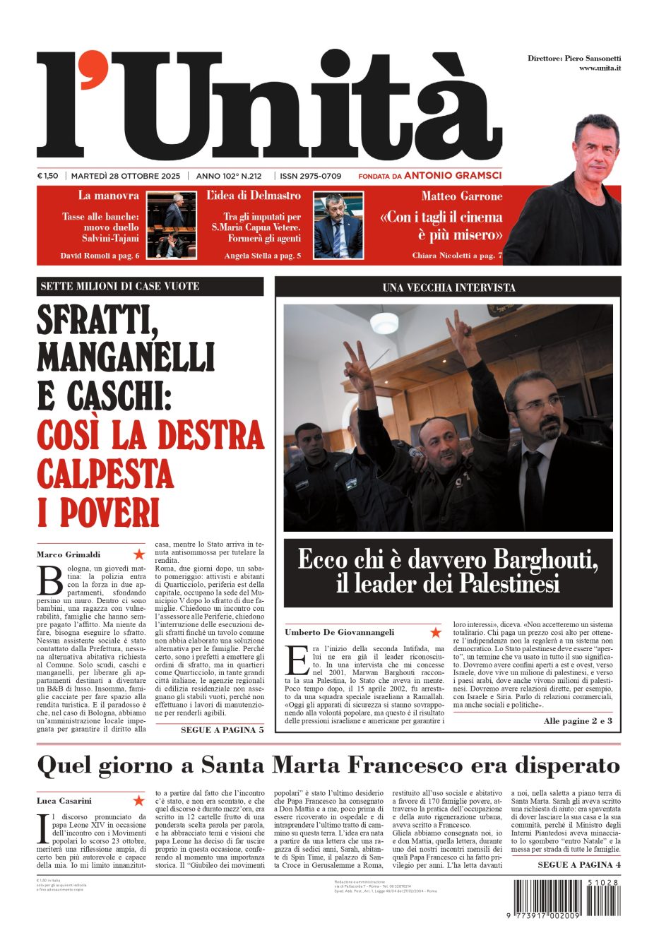 Riceviamo e pubblichiamo la prima pagina del giornale “L’unità”, oggi nelle edicole.