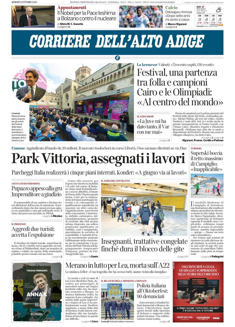 Riceviamo e pubblichiamo la prima pagina del quotidiano “Corriere dell’Alto Adige”, oggi nelle edicole in provincia di Bolzano.